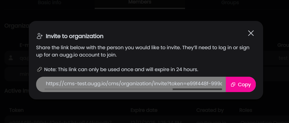 After creation, the active link remains visible on the Members page under a section dedicated to pending invitations.