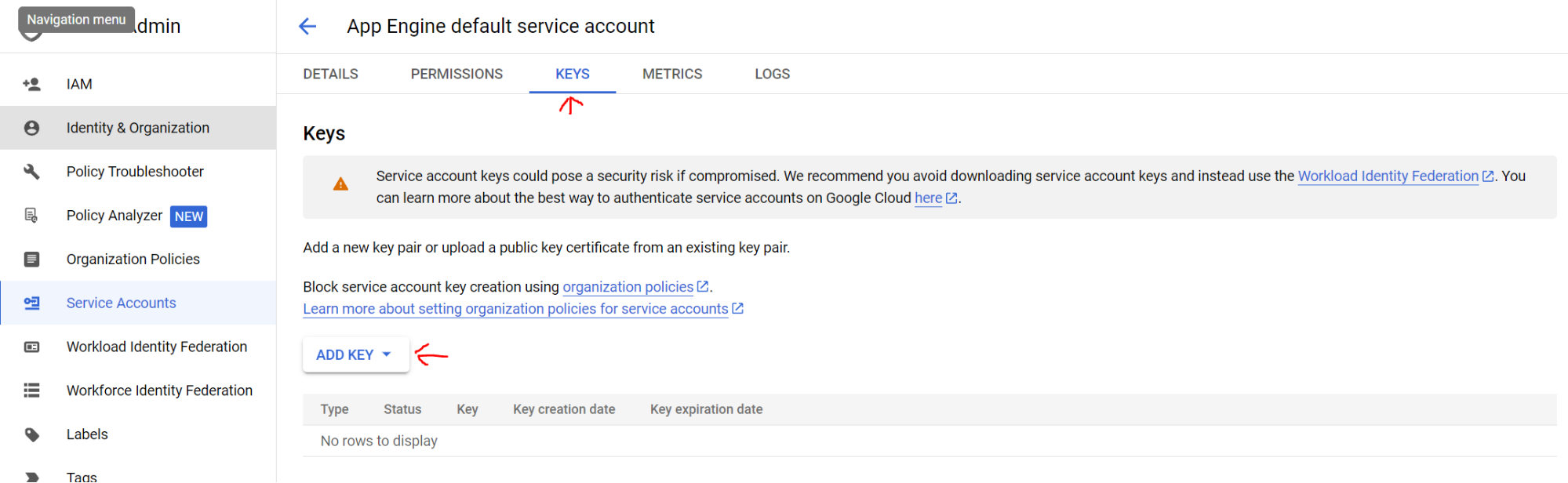 Click Keys. Click Add Key -> Create new key