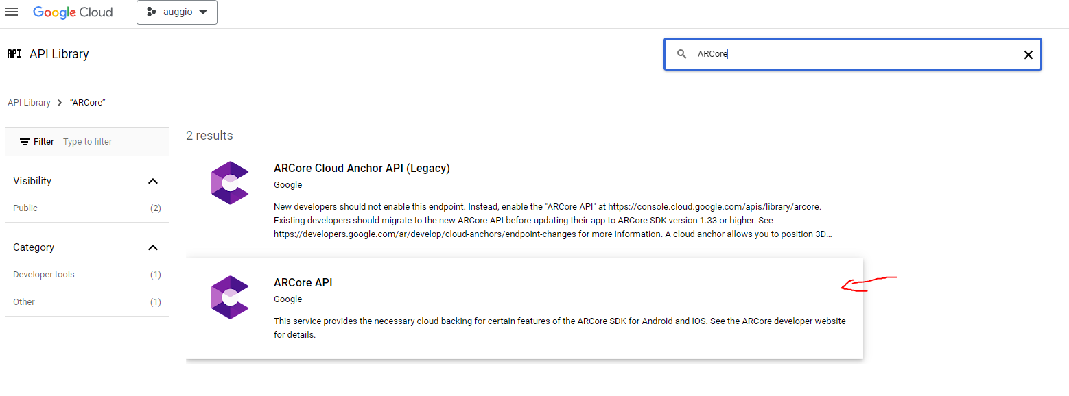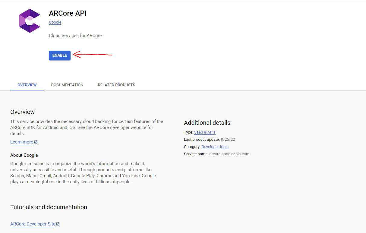 Enable ARCore API in Google Cloud console