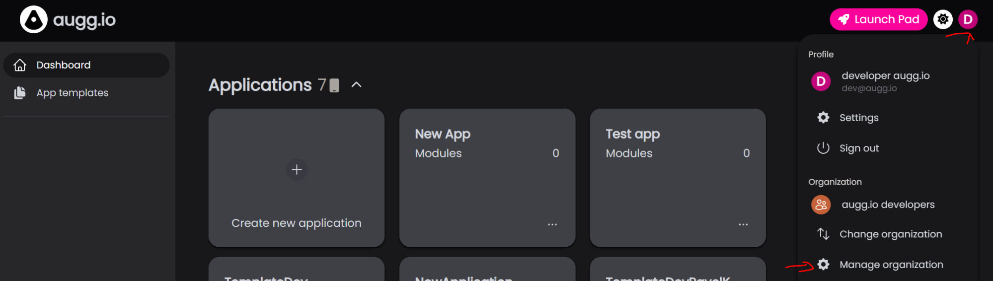 Click on profile in the top right corner and select manage organization.